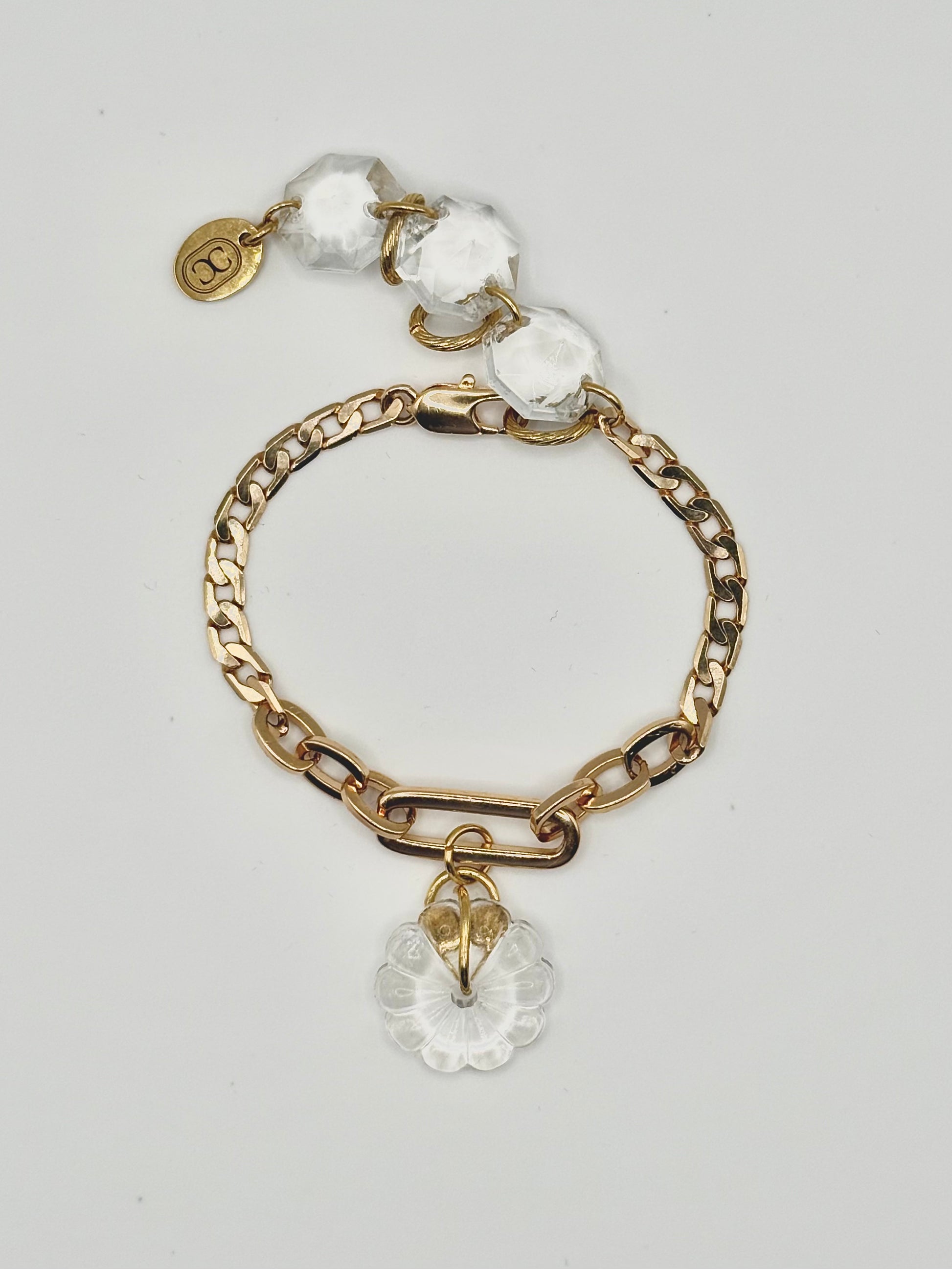 Le bracelet Bloom associe deux types de chaînes plaqué or en alternance, créant un rythme visuel moderne et affirmé. Au centre, une pampille fleur en verre de lustre vintage ajoute une touche sculpturale et lumineuse. Présent au poignet sans jamais gêner le mouvement, il affirme le style tout en restant confortable, pensé pour accompagner aussi bien les journées lumineuses que les soirées habillées.