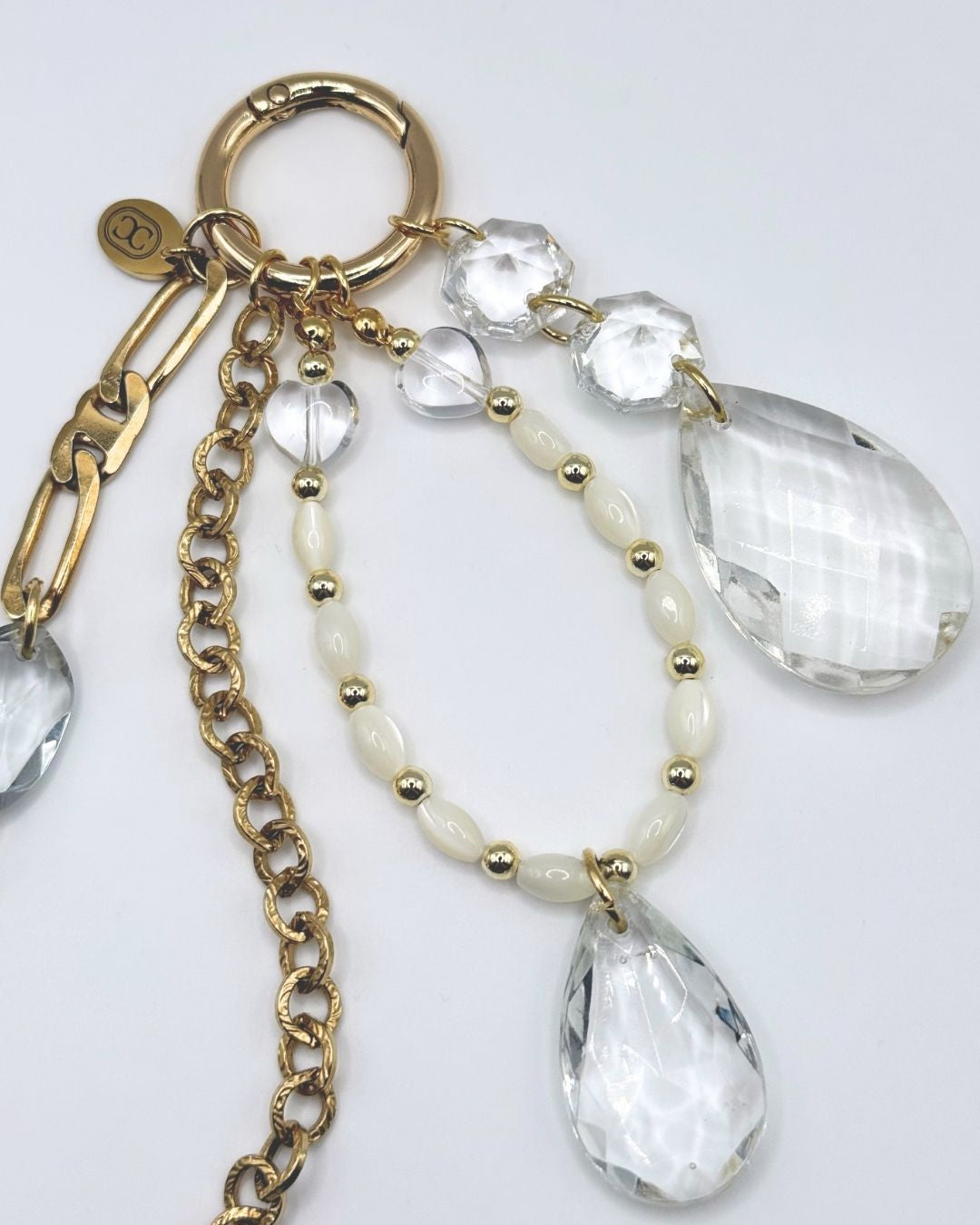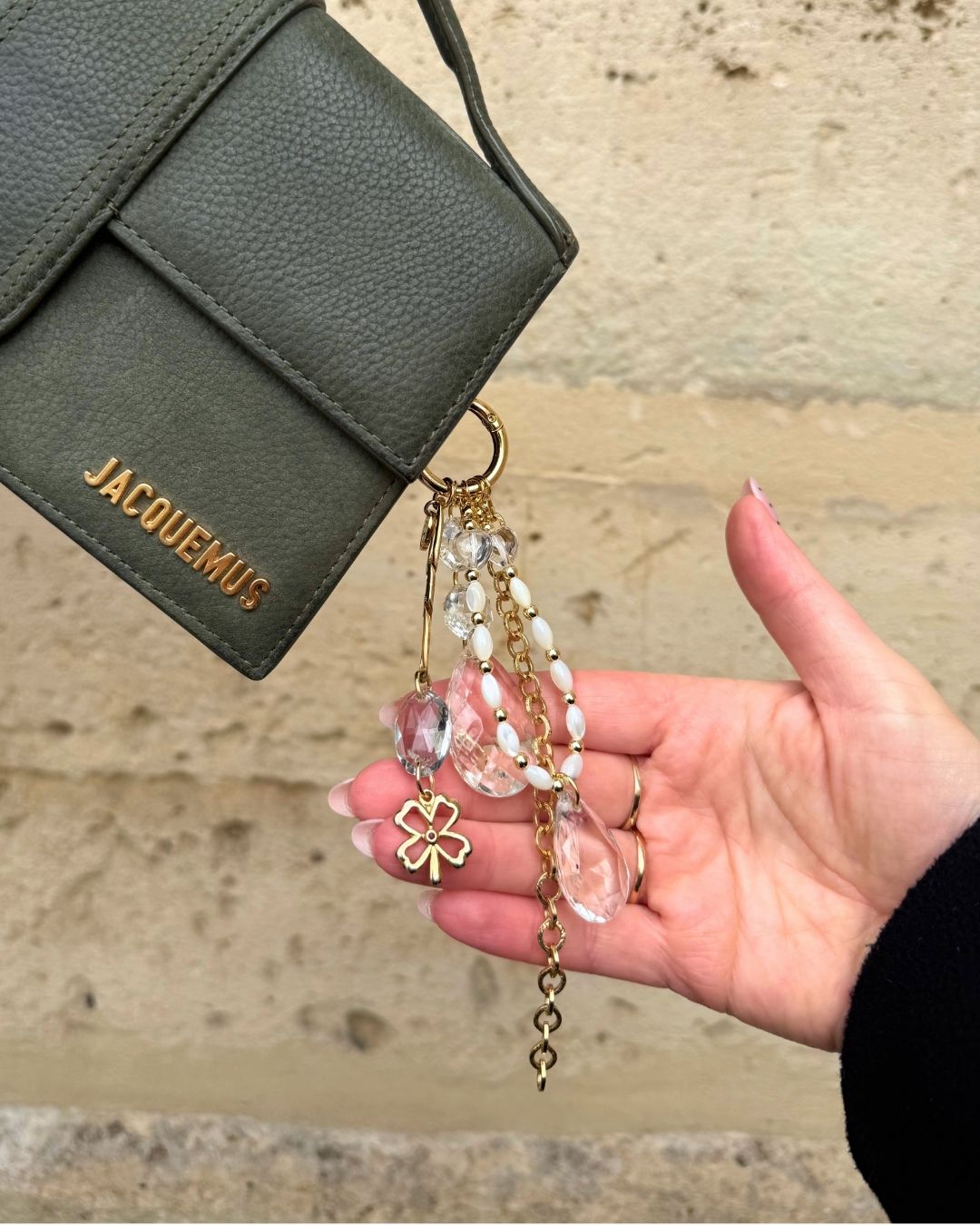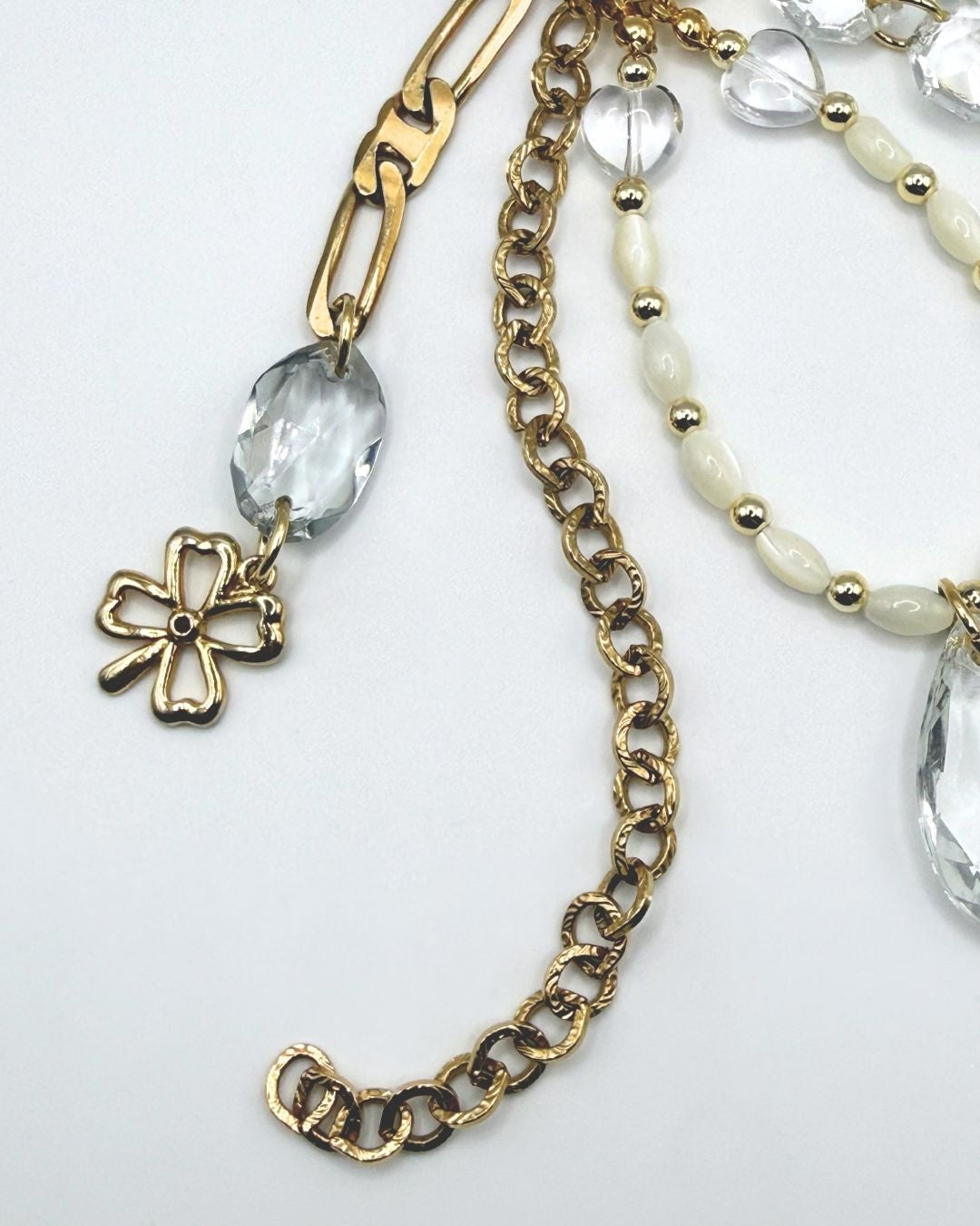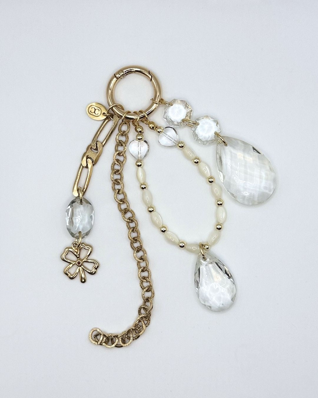 Pensé comme un talisman, le charm So Lucky compose un jeu de pampilles de lustre vintage en verre et de chaînes dorées dans une silhouette lumineuse et symbolique. Une pampille goutte capte la lumière avec intensité, accompagnée d’un trèfle vintage en pendentif, de chaînes anciennes et d’une délicate boucle de perles grain de riz en nacre.