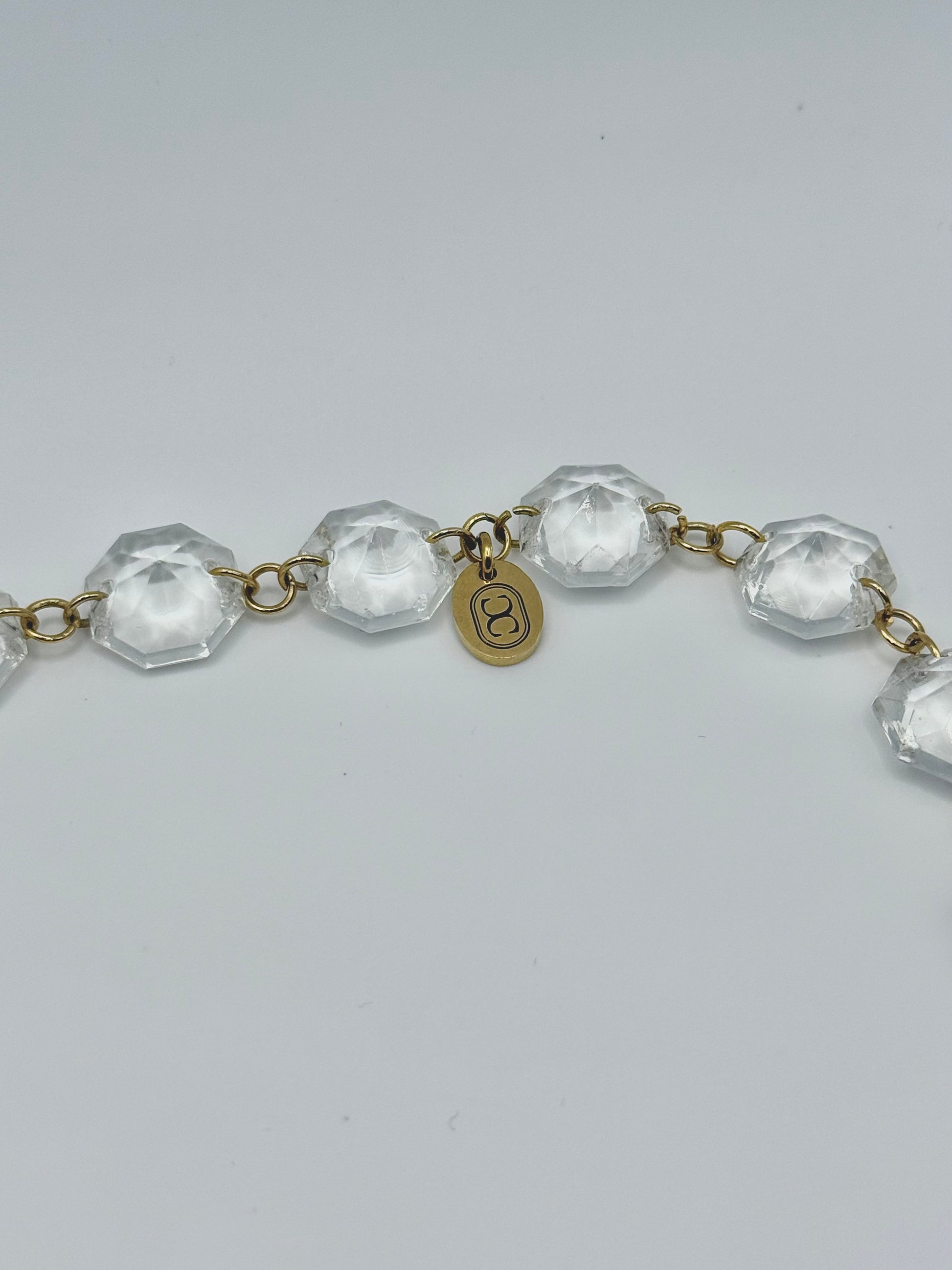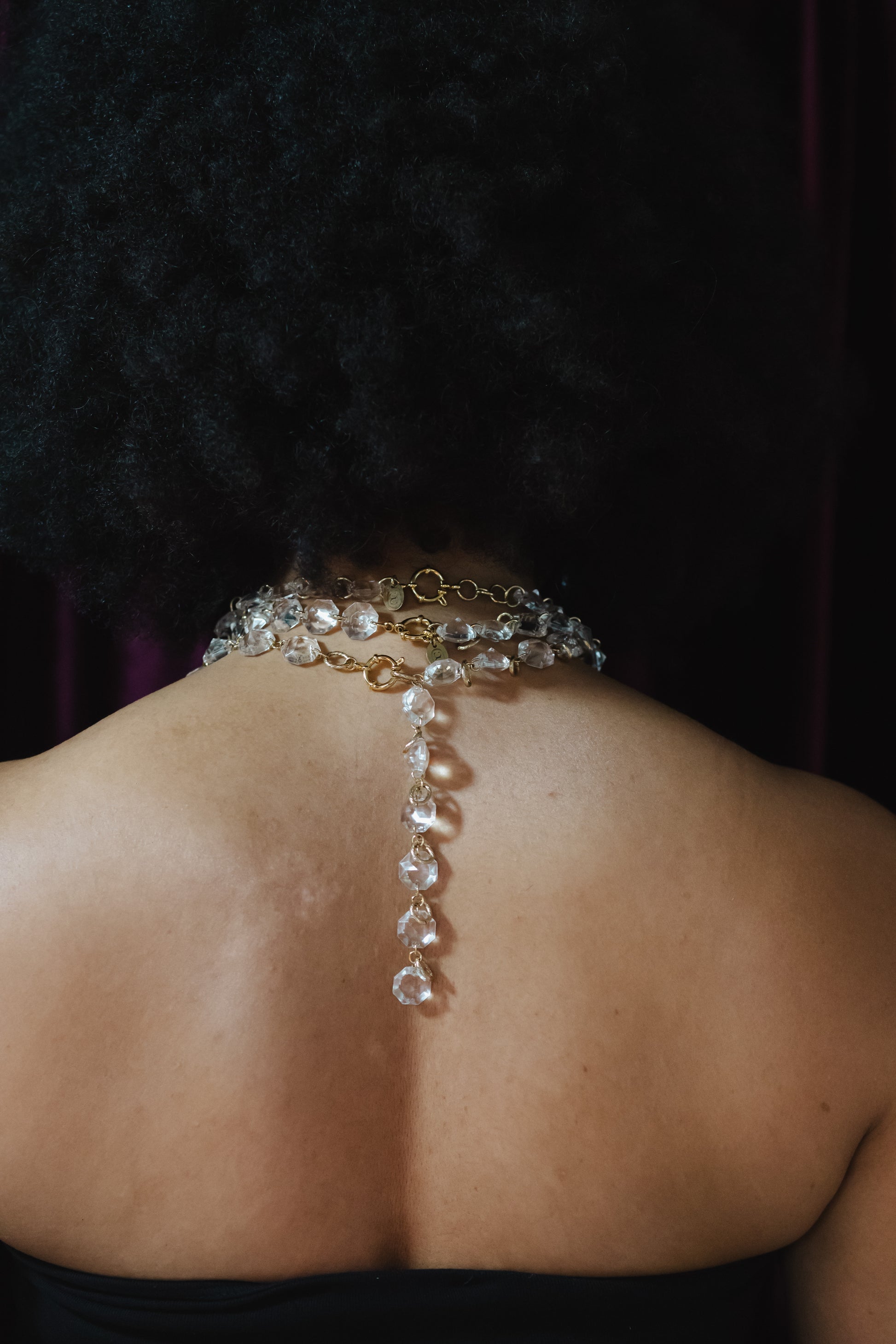 Le collier Romi Gold se compose d’une succession de pampilles en verre de lustre vintage, animées le fermoir en élément central. Le jeu de transparences crée une lumière mouvante au gré des gestes. Sa longueur modulable permet de le porter aussi bien long que plus court, et selon l’ajustement choisi, la cascade de pampilles à l’avant se déploie plus ou moins longuement pour créer un effet visuel discret ou spectaculaire.